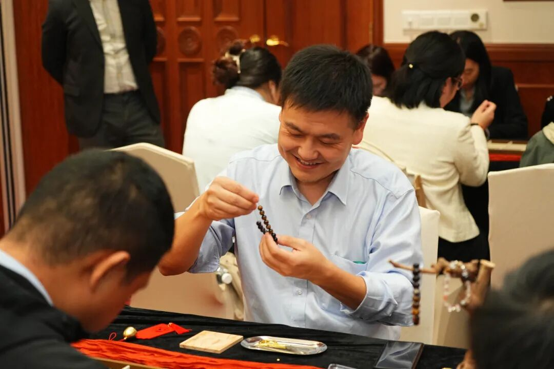 非遗国潮手作环节的现场布置尤为精心,处处彰显巧思:桌面以沉稳的深色桌布为底,上方覆盖着温润典雅的橙色桌旗,色彩对比间尽显格调,桌上错落摆放着多款水晶项链装饰摆件与质感细腻的雕纹盒,为现场增添了几分雅致韵味,让金融白领们在忙碌之余快速卸下疲惫。