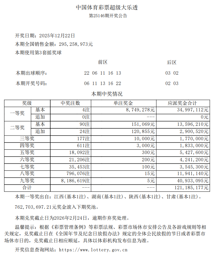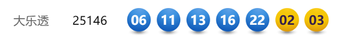12月22日,超级大乐透第25146期开奖。前区开出号码06、11、13、16、22;后区开出号码02、03。本期全国销售2.95亿元,为国家筹集彩票公益金1.06亿元。