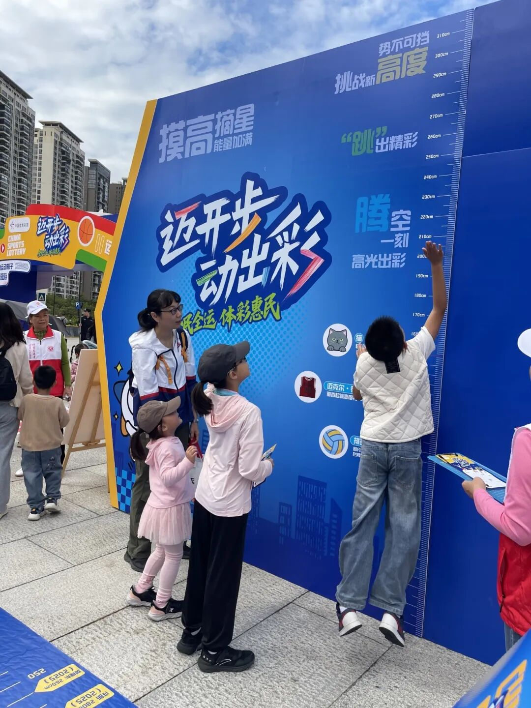 趣味游戏打卡区成为欢乐焦点。在“跳出精彩”跳高毯上,孩子们奋力起跳,家长在一旁加油鼓劲,欢声笑语此起彼伏;在足球射门区,参与者们屏息凝神,瞄准目标,一脚劲射,尽情释放运动激情。这些互动游戏将运动的专业性与游戏的趣味性巧妙结合,引导市民“迈”出参与体育锻炼的第一步,在轻松欢快氛围中“动出彩”。