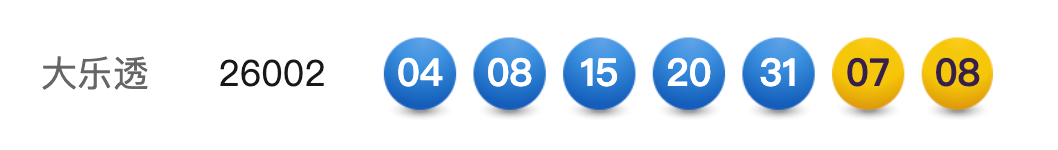 1月5日,超级大乐透第26002期开奖。前区开出号码04、08、15、20、31;后区开出号码07、08。本期全国销售3.00亿元,为国家筹集彩票公益金1.08亿元。