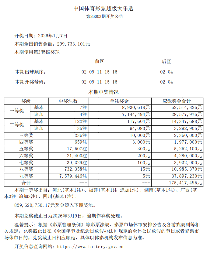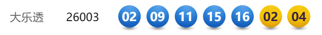 1月7日,超级大乐透第26003期开奖。前区开出号码02、09、11、15、16;后区开出号码02、04。本期全国销售2.99亿元,为国家筹集彩票公益金1.07亿元。