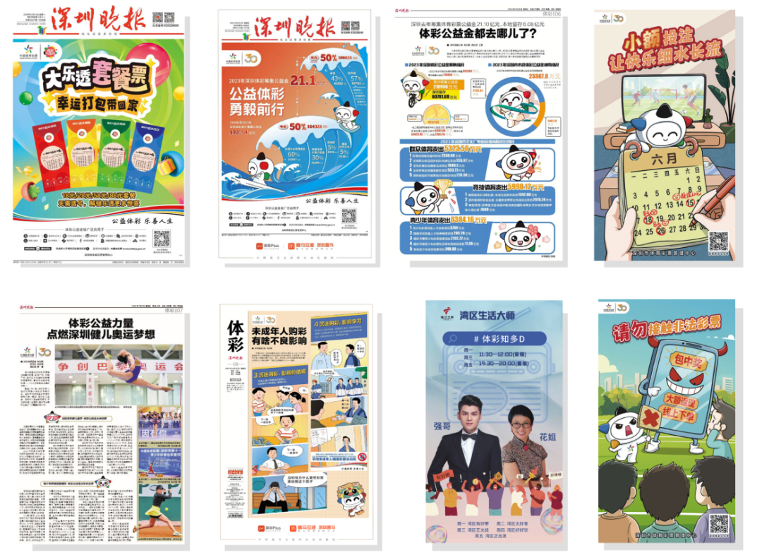 平面媒体宣传方面,深圳体彩联合主流报刊媒体开设常规性公益宣传版面,投放65个体彩报刊版面和6个头版宣传,强化公信力建设,凝聚社会共识。围绕2023年度深圳体彩公益金筹集和使用情况,打造《公益体彩 勇毅前行》《2023年深圳市体育彩票公益金筹集分配情况》等多款趣味海报,在《晶报》《深圳晚报》等主流报刊媒体头版刊登,引发市民广泛关注,深刻诠释了中国体育彩票“来之于民、用之于民”的发行宗旨。
