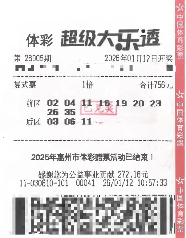 2026年1月12日,体彩超级大乐透第26005期开奖,位于惠州市大亚湾南边灶安置小区B区34号的4411030810体彩实体店迎来开年红,该店一购彩者喜中超级大乐透一等奖,这是当期全省唯一中出的一注大乐透一等奖,奖金高达711万元。