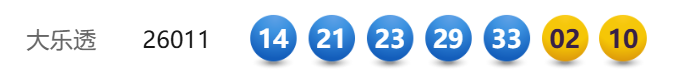 1月26日,超级大乐透第26011期开奖。前区开出号码14、 21、23、29、33;后区开出号码02、10。本期全国销售3.12亿元,为国家筹集彩票公益金1.12亿元。