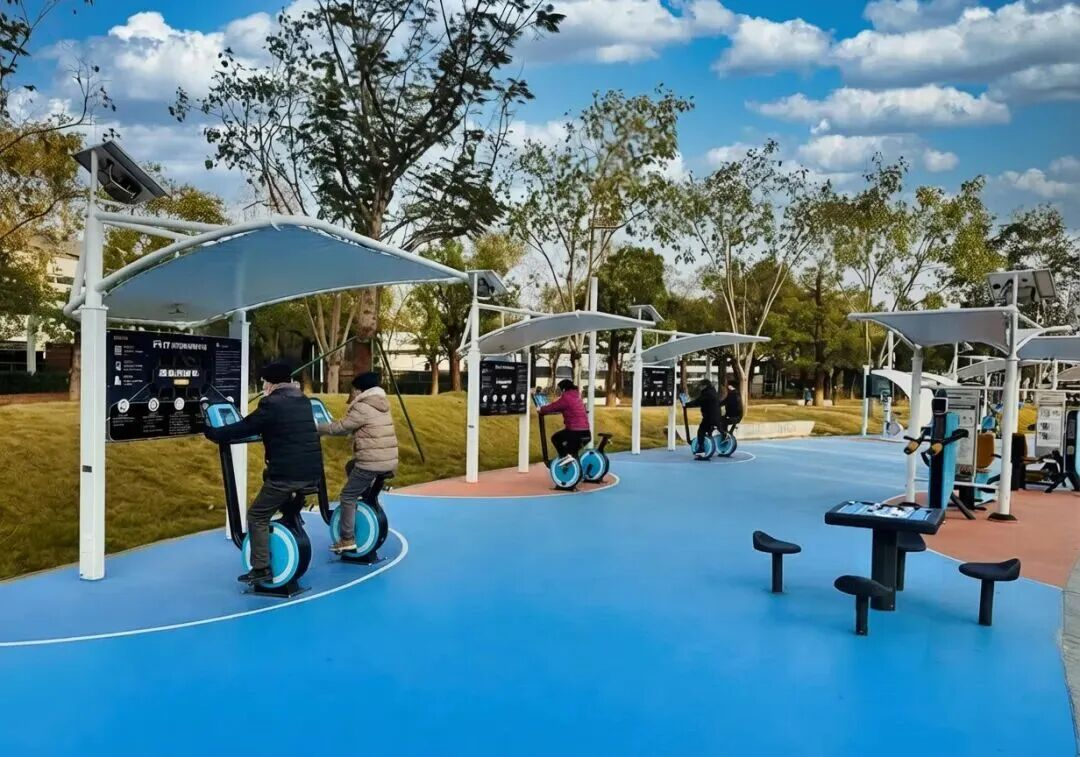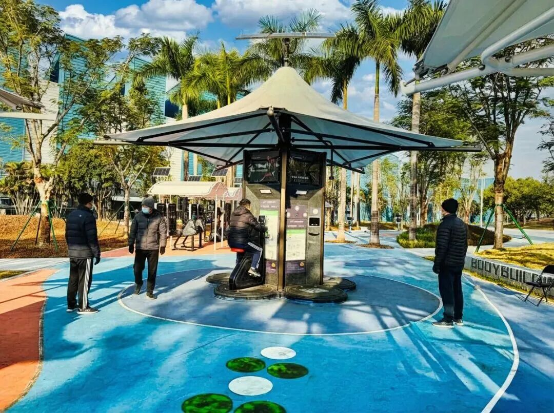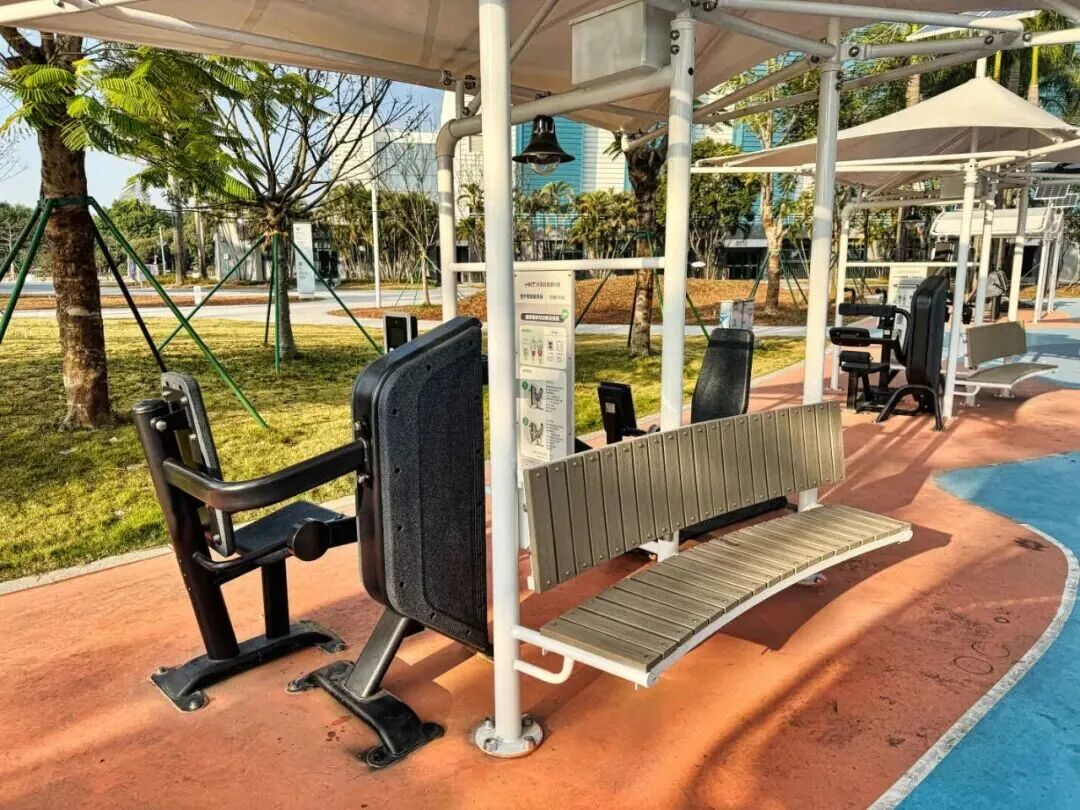 室外智能健身房配备高拉推举、腿部屈伸等八类双功能训练器,实现“测试-训练-测试-提高”的科学健身闭环;