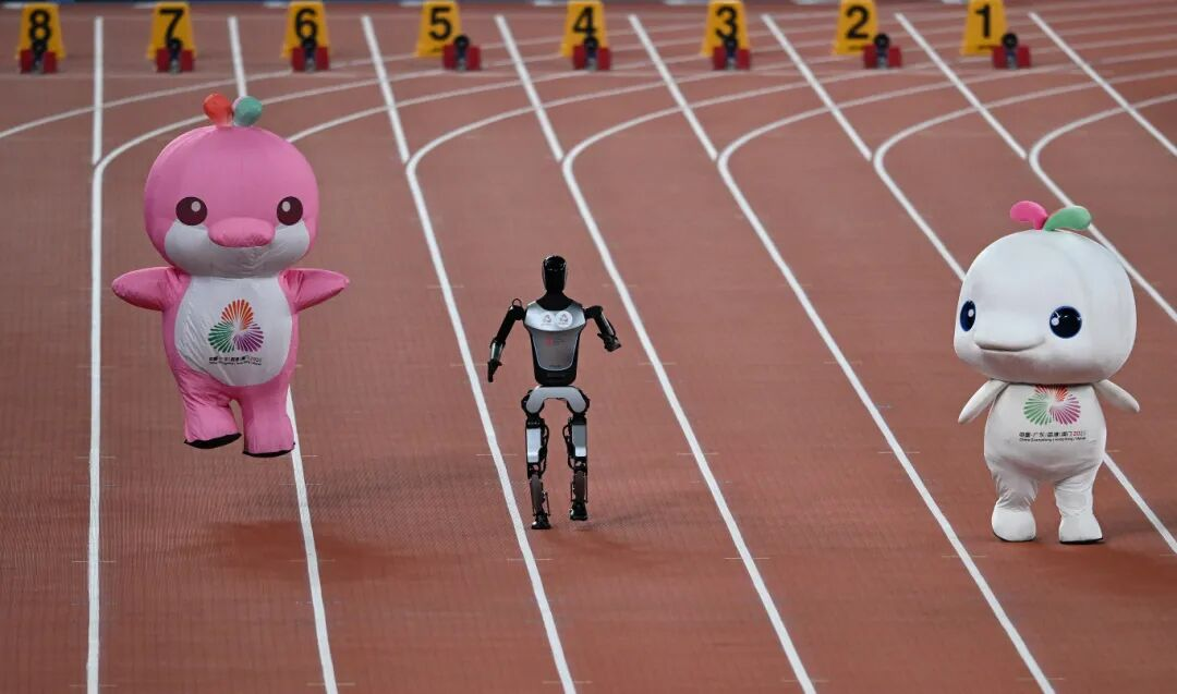 机器人和十五运会吉祥物喜洋洋、乐融融在广东奥体中心体育场赛跑。图/新华社