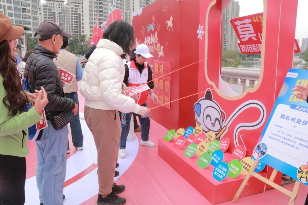 演出结束后,市民们纷纷前往体彩市集,开启趣味打卡之旅。作为本次活动的核心亮点,“新春贺岁市集”以红色为主色调,融入马年新春元素、体彩IP乐小星与传统舞狮特色,沉浸式感受岭南新春的喜庆气息。