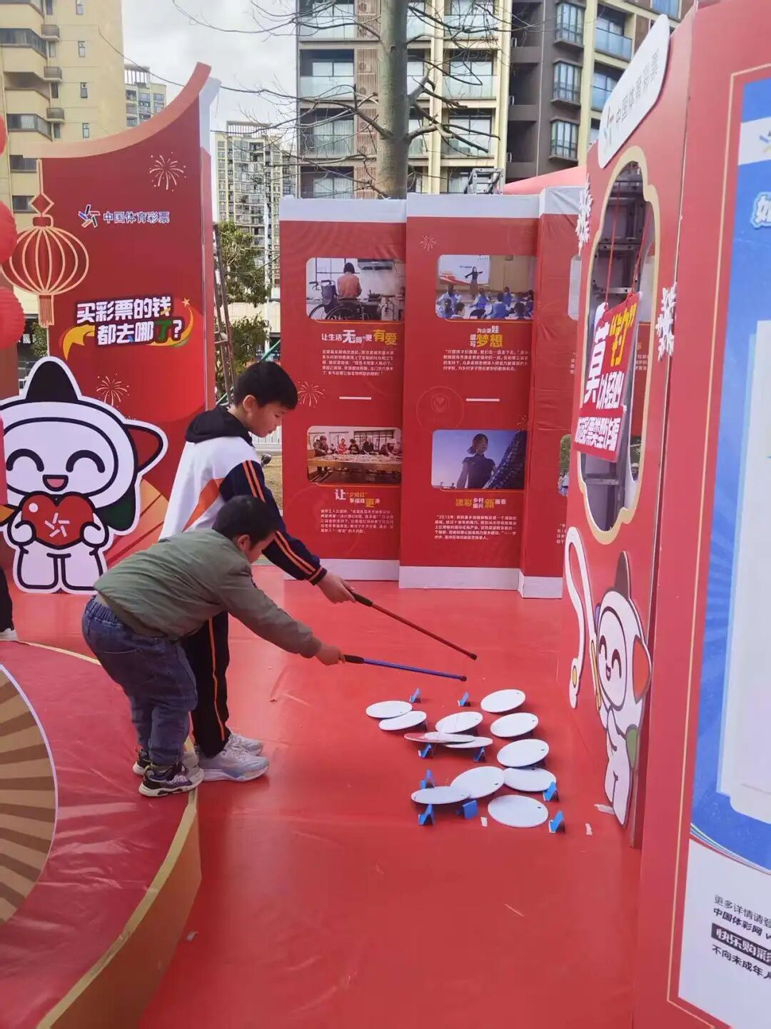 走进活动现场,多个主题区域联动发力。氛围布置区以中国红为主色调,红灯笼、春联、金色点缀交相辉映,“体彩新春季”主题背景板与乐小星IP形象吸睛亮相,成为不少市民的“新春打卡地”。大家举起手机合影留念,把节日的喜悦定格在镜头里。