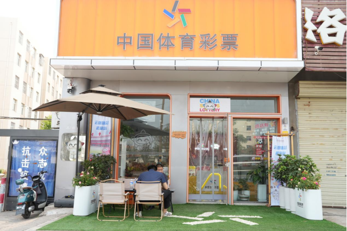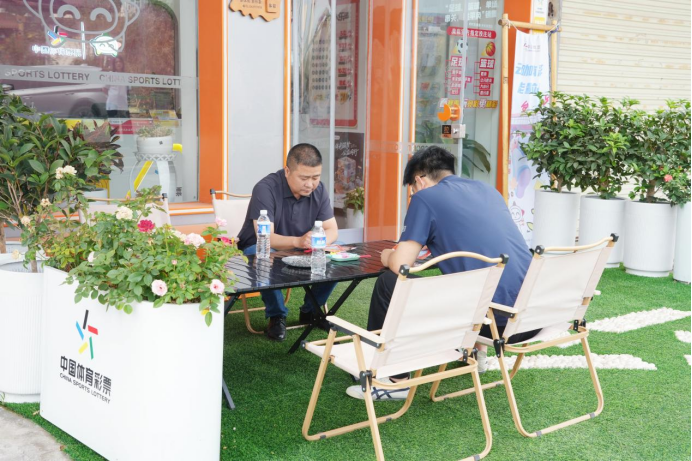 为了吸引年轻人的驻足,罗亮亮在店铺改造上花足了心思。门店外,特密加厚人工草皮铺就的地面搭配户外遮阳伞和露营桌椅为市民和游客提供了舒适的休憩空间,定制花箱和彩色鹅卵石布置的体彩logo,随手一拍都是“出片”背景。