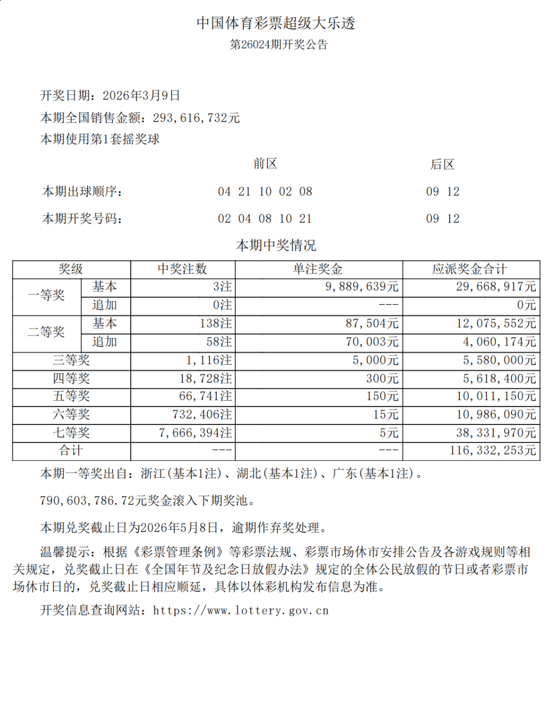 3月9日,超级大乐透第26024期开奖。前区开出号码02、04、08、10、21;后区开出号码09、12。本期全国销售2.93亿元,为国家筹集彩票公益金1.05亿元。其中,广东东莞中得1注基本投注一等奖,出自4417028384体彩实体店。