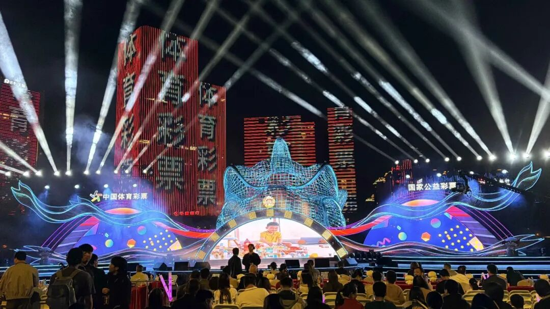 舞台后方,千灯湖城市建筑群灯光璀璨,绚丽光影中轮番呈现独家总冠名品牌“中国体育彩票”醒目字幕,与水上南海的迷人夜色交相辉映,成为当晚亮眼的城市风景。
