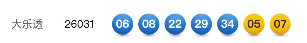 3月25日,超级大乐透第26031期开奖。前区开出号码06、08、22、29、34;后区开出号码05、07。本期全国销售3.21亿元,为国家筹集彩票公益金1.15亿元。