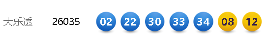 4月4日,超级大乐透第26035期开奖。前区开出号码02、22、30、33、34;后区开出号码08、12。本期全国销售3.24亿元,为国家筹集彩票公益金1.16亿元。