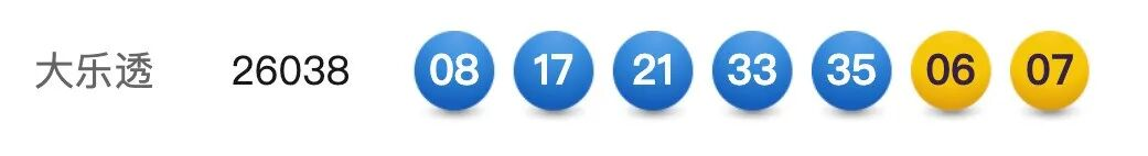 4月11日,超级大乐透第26038期开奖。前区开出号码08、17、21、33、35;后区开出号码06、07。本期全国销售3.43亿元,为国家筹集彩票公益金1.23亿元。其中,广东广州中得1注基本投注一等奖,出自4401023780体彩实体店。