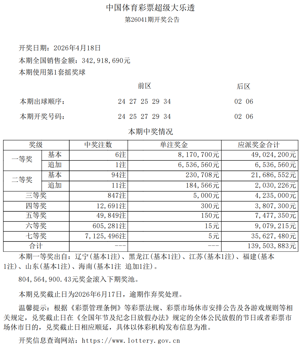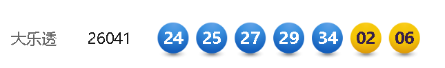 4月18日,超级大乐透第26041期开奖。前区开出号码24、25、27、29、34;后区开出号码02、06。本期全国销售3.42亿元,为国家筹集彩票公益金1.23亿元。