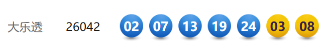4月20日,超级大乐透第26042期开奖。前区开出号码02、07、13、19、24;后区开出号码03、08。本期全国销售3.11亿元,为国家筹集彩票公益金1.12亿元。