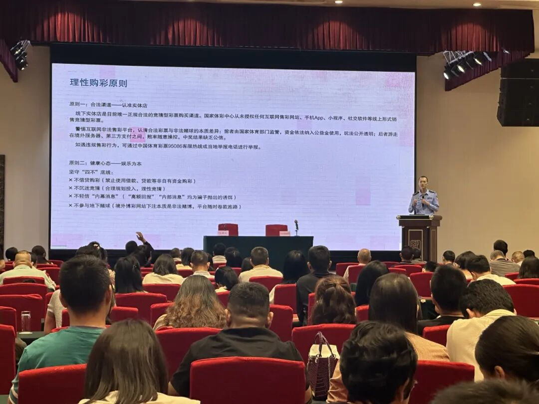 培训现场,丘警官围绕非法彩票的定义、常见类型及社会危害,系统解读了《彩票管理条例》等相关法律法规,并结合近年来查处的典型司法案例,深入剖析了非法售彩所面临的法律后果。针对即将到来的2026年世界杯,丘警官还详细讲解了赛事期间可能出现的各类非法售彩风险及相应的防范措施。最后,他发出依法合规经营、自觉抵制非法彩票的倡议,为全市体彩从业者敲响法治警钟,呼吁大家共同维护河源体彩市场的纯净与安全,筑牢防范非法彩票的坚固防线。